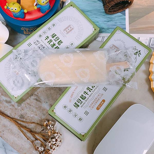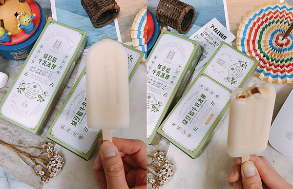 實際一咬!除了外層主要是牛乳製成的冰棒外,內餡的綠豆沙真的好好吃啊,就是一種很台灣古早味的回味,再咬一口,內餡都還有QQ的寒天添加,用以增加口感,以創造QQ的味覺層次,也因此,也就是說,一口就能有牛乳冰棒、綠豆椪內餡、寒天QQ的三種口感的很具層次,同時也真的蠻好吃的綠豆椪神還原。